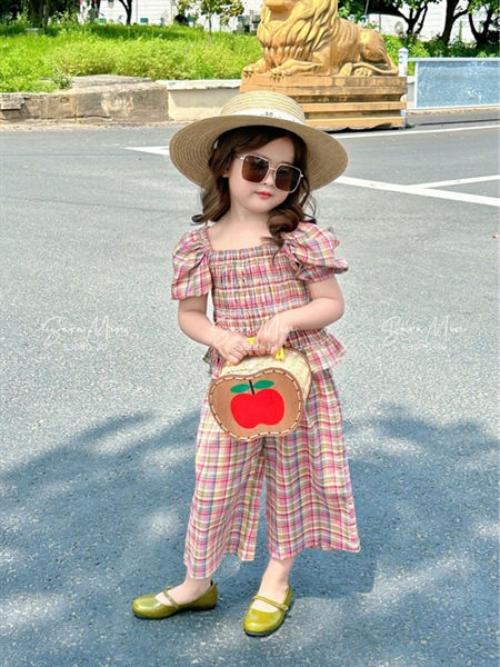 Set bé gái kẻ caro đỏ hồng thiết kế áo tay búp phồng smocking thân áo phối quần suông