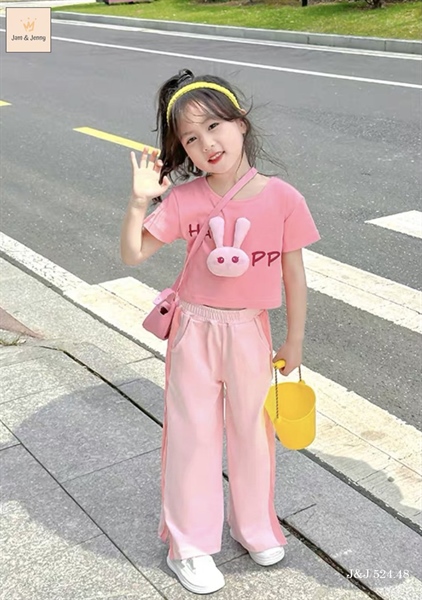 Set bé gái thiết kế áo crop nơ đính thỏ phối quần suông hồng