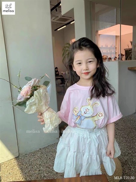 Set bé gái thiết kế áo hồng nhạt hình thỏ phối chân váy trắng xoè