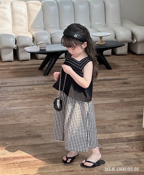 Set bé gái thiết kế áo sát nách suông màu đen cổ vuông viền trắng phối quần cullotes caro trắng đen