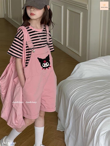 Set bé gái thiết kế yếm quần hồng Kuromi phối áo thun sọc hồng đen