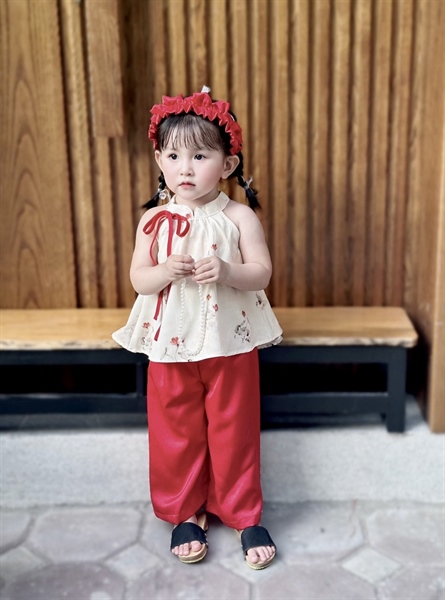 Set bé gái yếm hoa đính dây nơ đỏ phối quần suông đỏ kèm băng đô