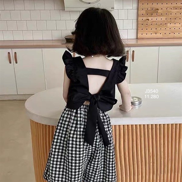 Set bộ bé gái áo croptop cách điệu cutout lưng phối quần caro ống rộng