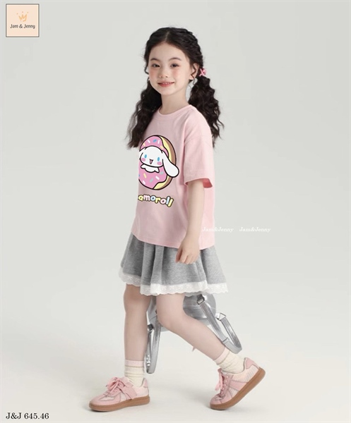 Set bộ bé gái áo thun Cinnamoroll hồng phối quần giả váy ống rộng màu xám nhạt viền ren trắng