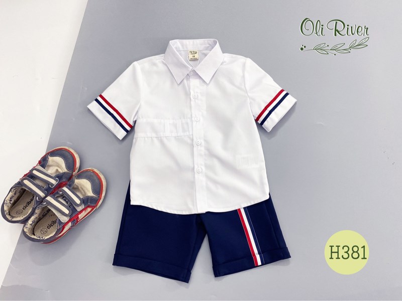 Set bé trai thiết kế áo sơmi ngắn tay kẻ viền tay phối quần short